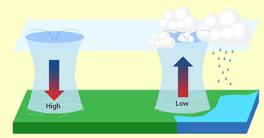 Cyclone is a low area of atmospheric pressure. It is a giant air whirlpool in which air in the northern hemisphere moves counterclockwise, and clockwise in the southern hemisphere. They travel from west to east and their dimensions can vary from a few hundred to a few thousand kilometers.