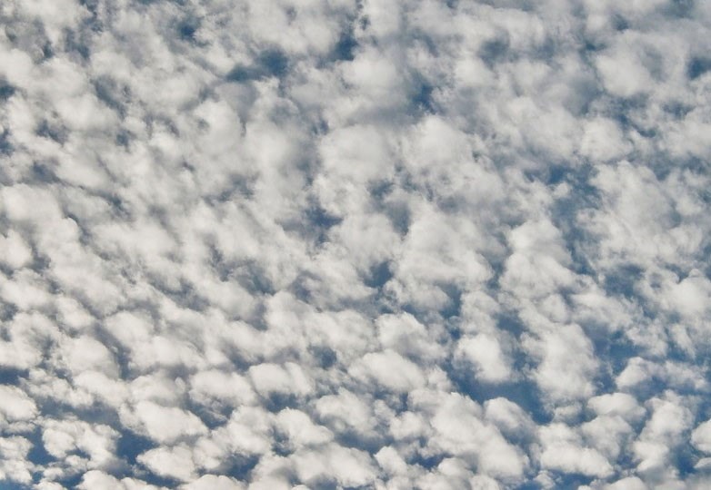 Cirrocumulus (Cc) - given that they always appear together with cirrus and cirrostratus clouds, it is considered that they arise from their degeneration. These are small icy clouds, similar to "sheep" and are composed of tiny white spots which give the impression that the sky is covered with lace. They are arranged in groups, or in more or less regular stripes. There have holes among white clumps, through which you can see blue sky, so it seems like a net. These clouds do not cause precipitation.