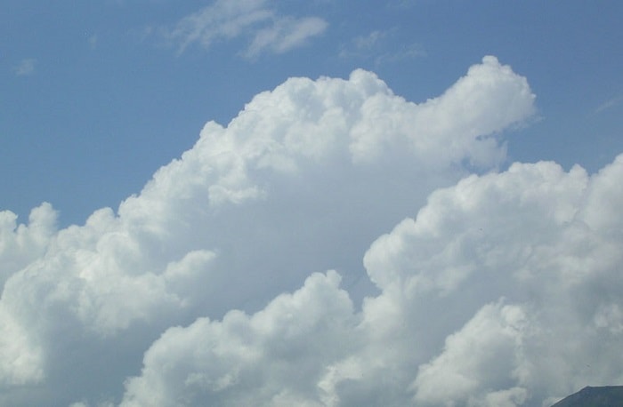 Cumulus (Cu) - these are the clouds which are composed of water droplets, they are ripped and chunky, and they appear in chunky or sharp shapes so they seem swelled. They rise very high, so they can be compared with the giant cauliflower. Cumulus clouds belong to the most beautiful clouds, because parts of the cloud illuminated by the Sun are glittering and white, while the horizontal basis in the shadow is dark. They are not formed nor retained over the sea surface. They can serve as orientation when approaching the coast from the open sea.