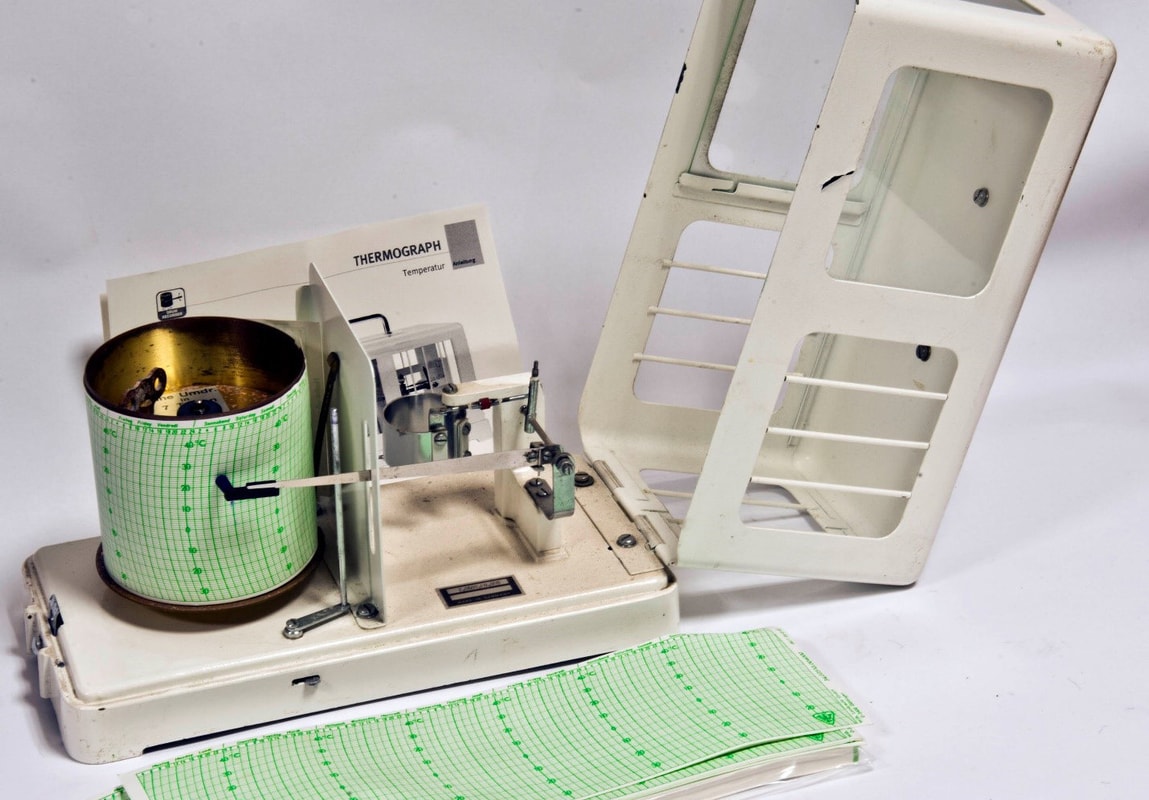 Thermograph constantly measures the air temperature change. It consists of a printer and a sensor. The sensor is actually a bar (bimetal ring) or "Bourdon" tube stuffed with gas which responds to temperature changes, which are then recorded on a printer. The printed tape of the thermograph is called a thermogram.