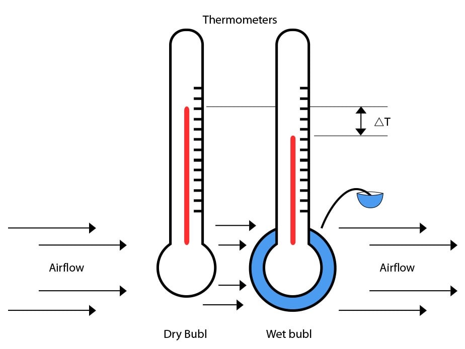 - Dry-bulb thermometer, i.e. an ordinary thermometer that measures the air temperature, which comes with a wet thermometer used for measuring air humidity. An ordinary thermometer is filled with mercury and shows the air temperature in Celsius degrees.