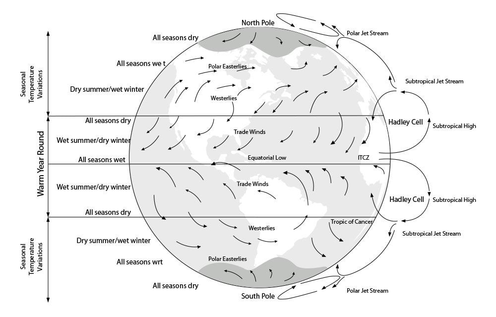- Westerlies - These are permanent winds that flow from the west towards the east. These winds flow in the Earth's middle latitudes between 30 and 60 degrees. They are also referred to as anti-trades, since these winds originate from the high-pressure areas in the horse latitudes and flow towards the poles and direct extratropical cyclones in this general manner.