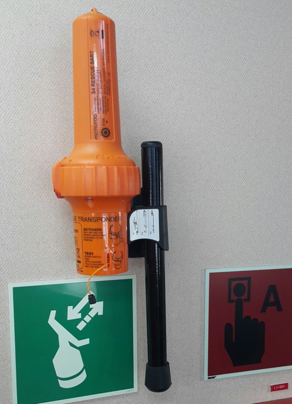 During navigation, the device is held in girders on the navigating bridge, in a clearly visible position. There must be a fluorescent self-adhesive SOLAS tag for the SART device next to it.