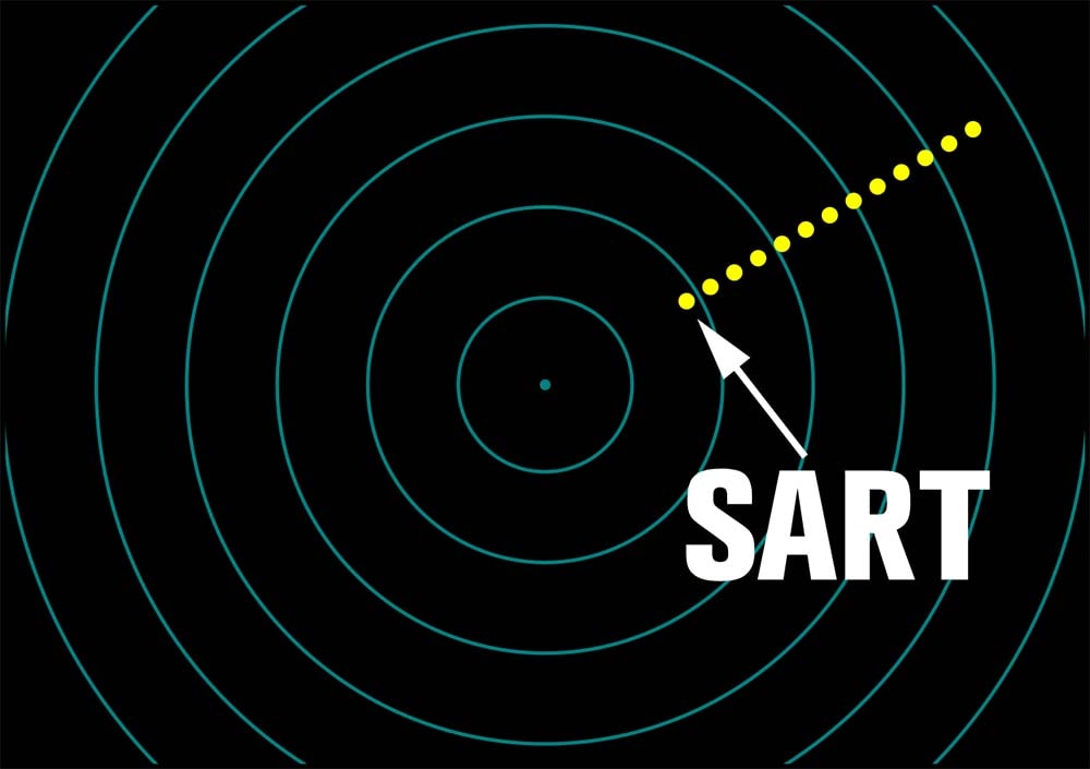 SART is a small portable device that emits signals (radar waves at f = 9GHz). They are received by the radar and are displayed on the screen as twelve evenly spaced dots in one direction, indicating the direction from which the signal was sent. The range of the device depends on the height of the radar antenna and the power of the radar. The device has a built-in power supply, so it can receive signals for up to 96 hours and transmit for up to eight hours.