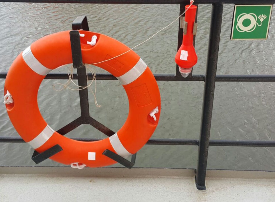 Lifebuoys are used to prevent people from drowning in the sea. They also mark the position in the sea very well. They are evenly spaced on both sides of the ship and are not attached. At least one buoy on each side is equipped with a rescue rope (twice as long as the height of its location; at least 30m). At least half of the buoys have a light (which illuminates continuously or flashes for two hours). At least two lifebuoys with light are equipped with smoke signals (which smoke for 15 min). The weight of the buoy must not be less than 2.5 kg. The name of the ship and the port of entry must be written on each belt in Latin.